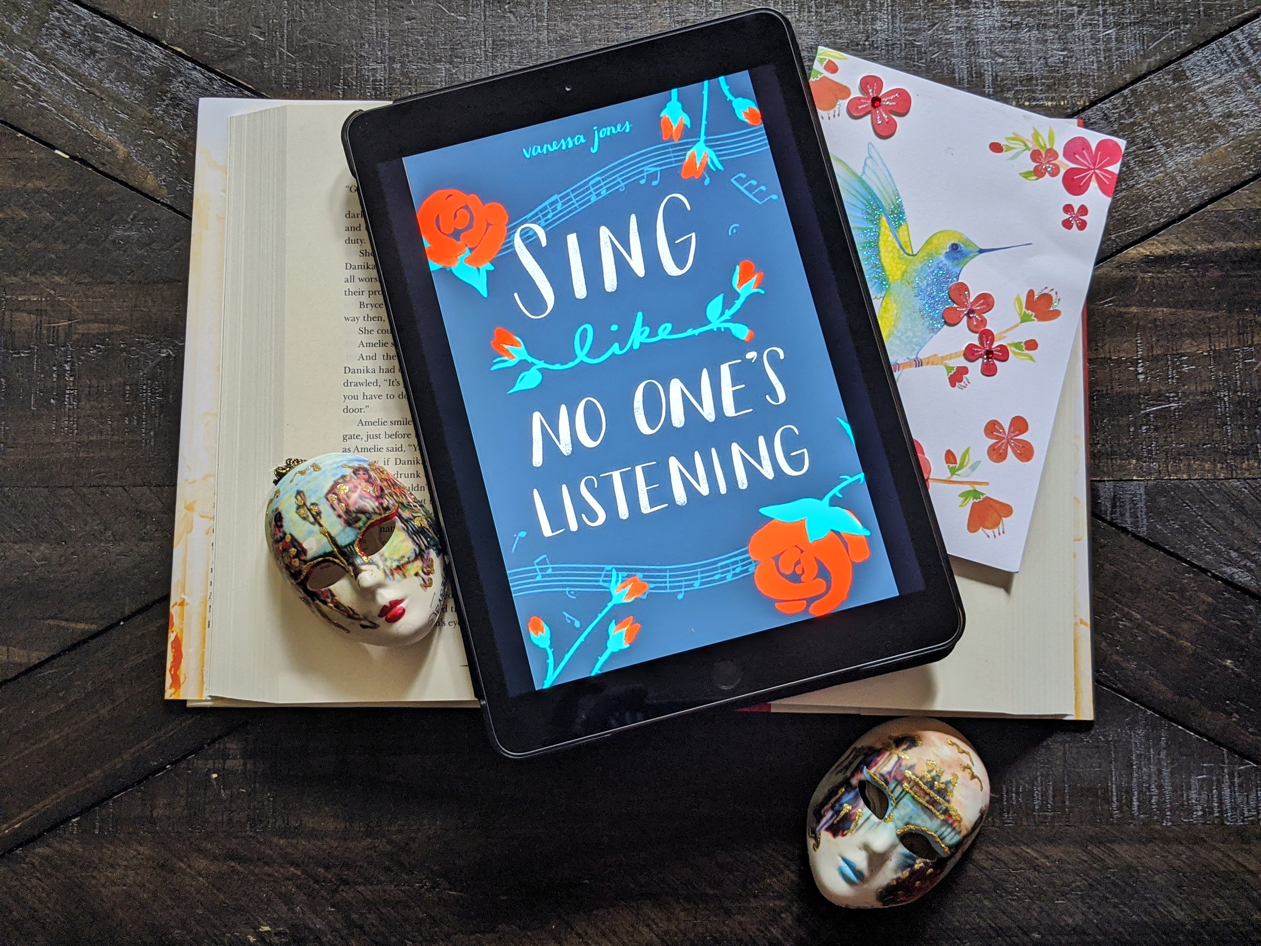 #netgalley #arc #singlikenooneislistening #vanessajones #theaterarts #bookstagram #flatlay #kindle #wordsnobs #masks #hummingbird #roses #netch #collaboration #bookobsessedmomma