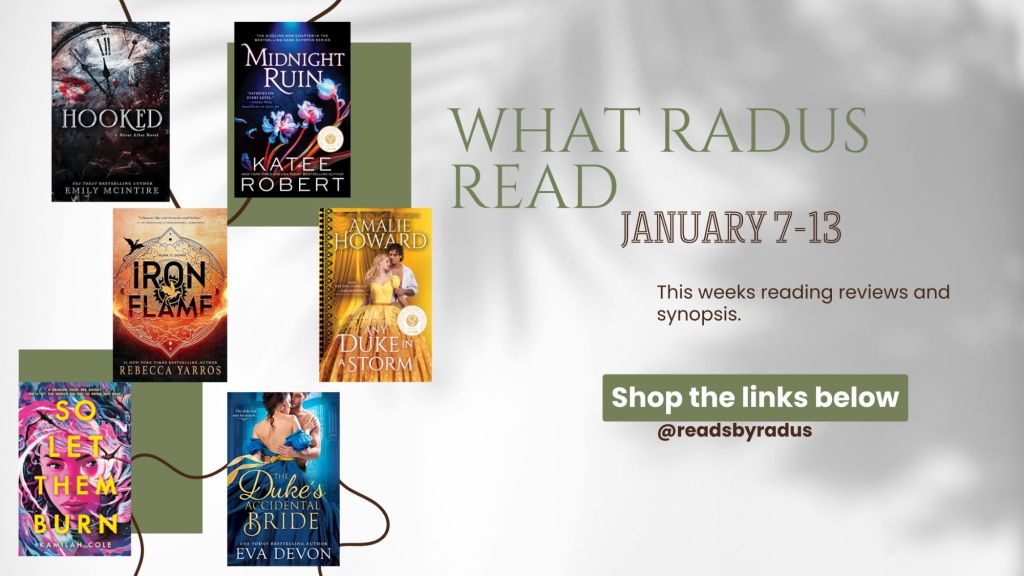 I had a great reading week! A few of these were quick delicious reads! I’ve finally finished Iron Flame, it went quick after I was able to find time. I was trying to keep on arc schedule at the end of the year and just kept putting it off.